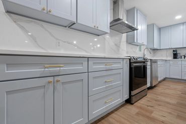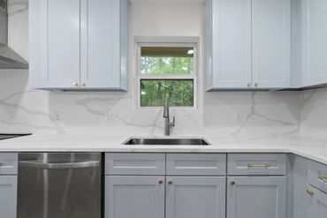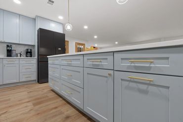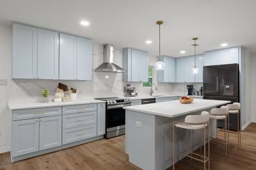 • Light blue custom cabinetry for a fresh modern look